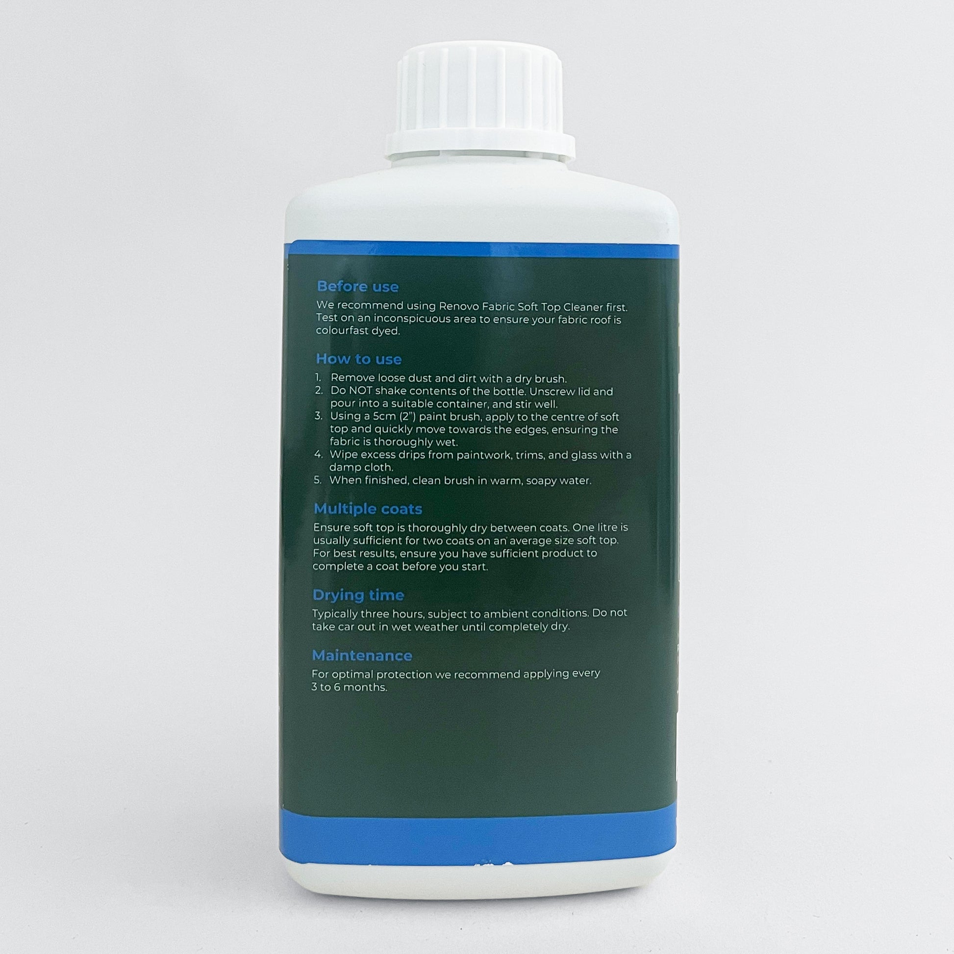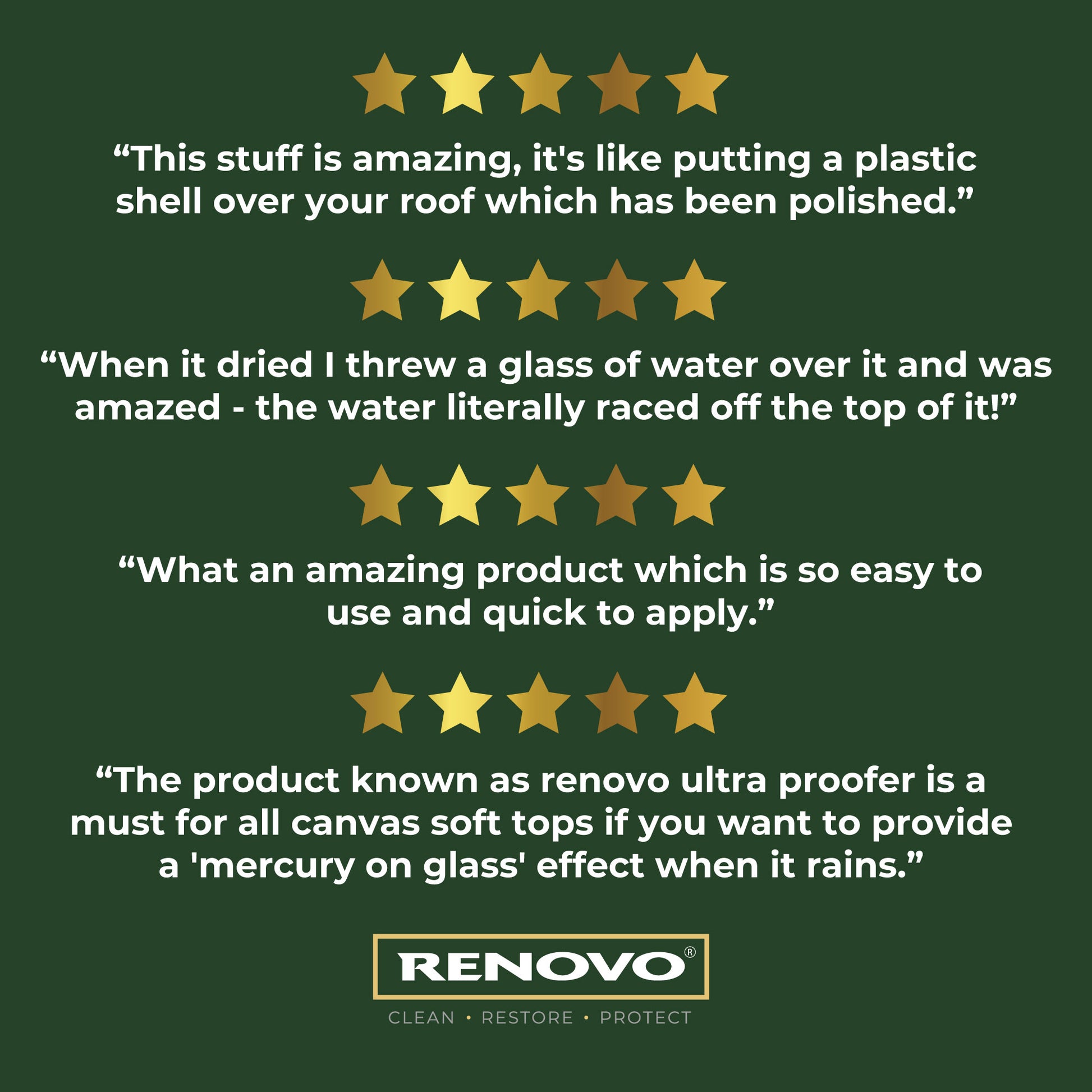 Ne pas utiliser sur les toits en vinyle – utiliser le nettoyant pour toits souples en vinyle Renovo et l’imperméabilisant ultra pour toits souples en vinyle.