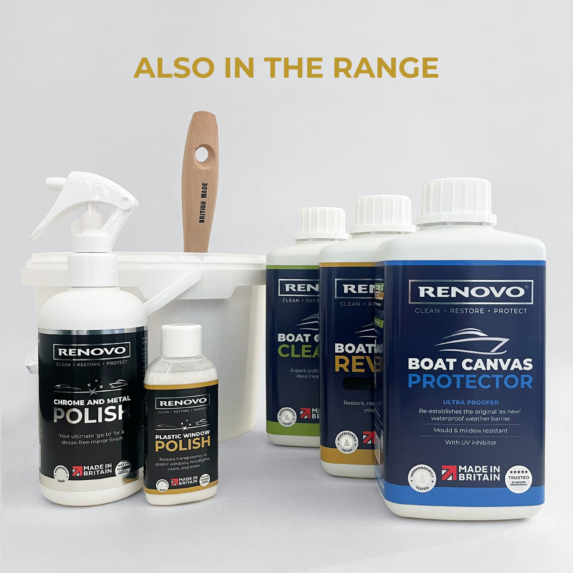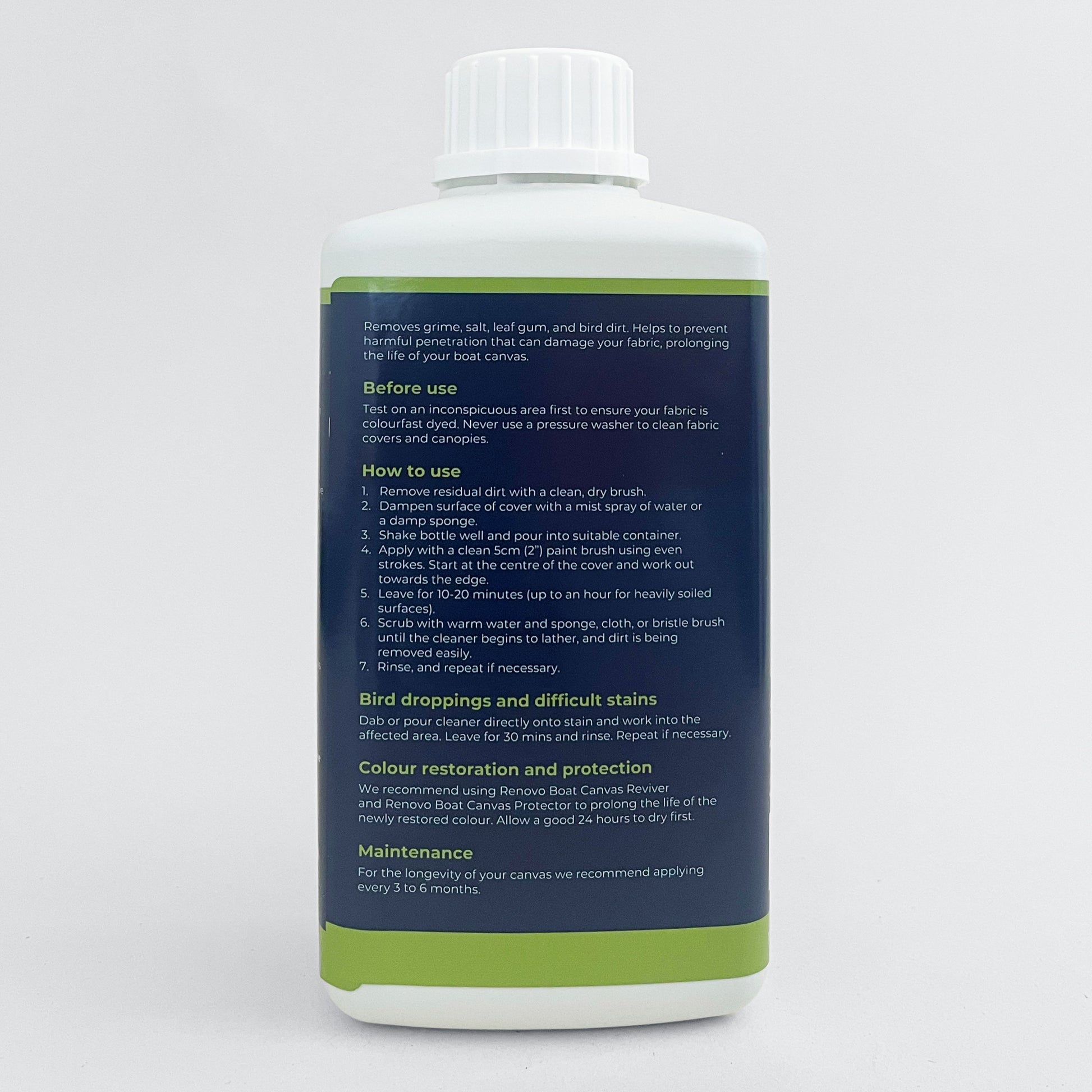Consigliamo di usare Renovo Boat Canvas Reviver e Renovo Boat Canvas Protector per prolungare la durata del colore appena restaurato. Lasciare asciugare per almeno 24 ore.
